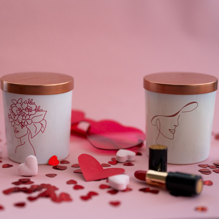 Zestaw dwóch świec sojowych z naszymi autorskimi ilustracjami na pojemnikach.